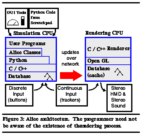 Several other VR systems, including the MR Toolkit [MR], also use multiple processes, but they require the programmer to control both: one process is typically viewed as the "interaction process" and the other is the "computation process," and the programmer must explicitly handle all data communication between the two. In Alice, we make the process separation transparent to the programmer, who writes a single-process simulation. Figure 3 shows a block diagram of the system.